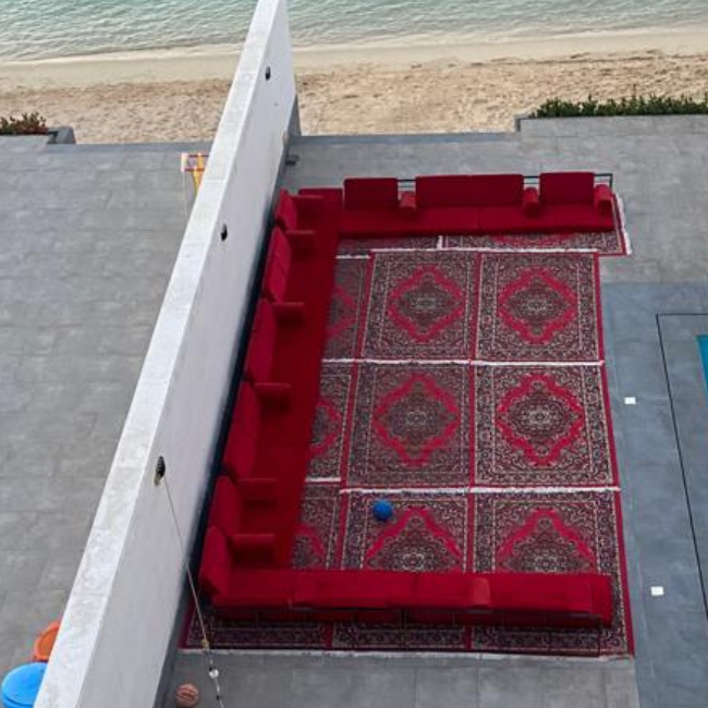 طقم جلوس عربي ذات تصميم تراثي ، مكون من مسند مصمم بإحترافية وجودة عالية مع زوايا علوية للحصول علي راحة جلوس وإرتكاء أفضل مبطن بإسفنج عالي الكثافة يضمن دعما أكثر للظهر، قماش عالي الجودة متين للإستخدام الخارجي أو الجلسات العائلية، سهل الطي والحمل للرحلات والحدائق والتنقل.